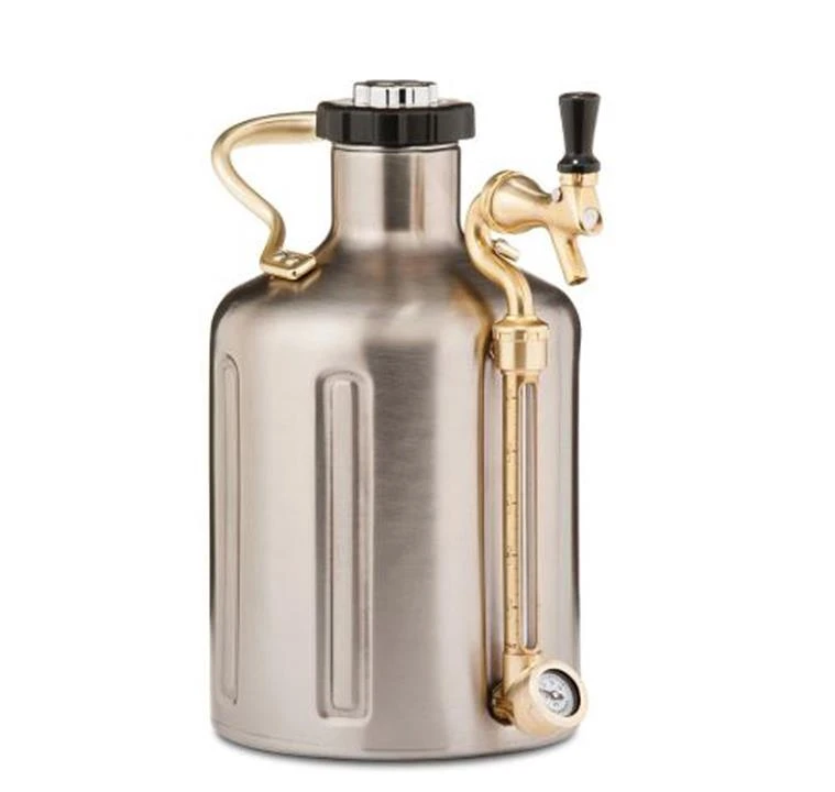Our uKeg 128 pressurized growler is a mini keg in the size of a full-gallon growler, keeps beer cold, fresh and carbonated for two weeks. On the go or at home. Durable, double-wall vacuum insulated stainless steel. CO2 regulator cap with customizable tap handle and gauge. Includes two 16 gram CO2 cartridges.