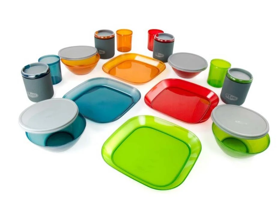 INFINITY 4 PERSON DELUXE TABLESET- MULTICOLOR The Infinity 4 Person Deluxe Tableset consists of completely recyclable, BPA-Free polypropylene that wonβt absorb odors or leak chemicals into your food. This set includes 4 nesting bowls, 4 insulated mugs with Sip-It lids, 4 large plates, and it all comes in a compact mesh stuff sack.