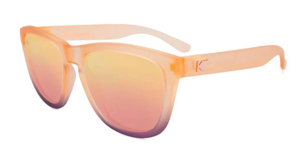 The frosted rose quartz Premiums sunglasses are a new spin on our favorite Classics frame style. These timeless, carry-everywhere shades are a must-have for your next trip to the lake or weekend get-together with the squad. Color pops on the frosty rose fade frame, complemented by rose-colored mirrored lenses. There are even rose gold K logo accents to match! Featuring a slightly wider and more accommodating frosted rose frame, these unisex rose-tinted sunglasses provide a comfortable and flattering fit for most face shapes and sizes. The Instagram ready frosted rose quartz Premiums are truly one-of-a-kind!