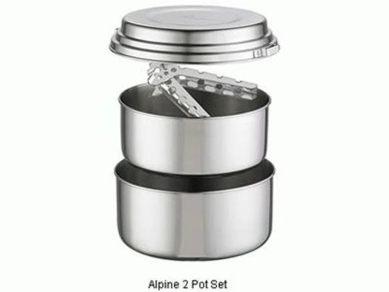 The Alpine 2 pot set is made from incredibly durable stainless steel, reliably standing up to even the most extreme conditions. It s perfect for heavy use by frequent travelers, or by guides and institutions, where you ll be preparing a lot of meals on a wide range of adventures. Part is the Expedition series, the Alpine2 setis super strong, durable and dent-resistant yet only weighs 733 grams.Large volume pots and rugged designs are what you want for tasks like melting snow and brewing-up to stay hydrated. The Expedition Series includes larger, multi-function pots up to the task and the MSR Heat Exchanger to make the most of your precious fuel resources. The set includes an Alpine 1.5 and 2-liter pot, lid, PanHandler and reusable nylon stuff sack. Naturally the pots nest for ease of packing. Whatโs more, most MSR stoves fit inside the nested pots for extreme compactibility. MSR cookware and stoves are intelligentely designed to work together. This modularity means you can nest various pieces together allowing you to mix and match components to tailor your needs.