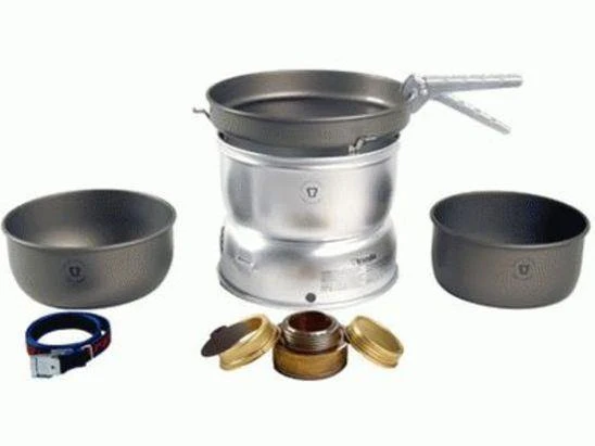 The25 Series are larger stoves that are best suited to groups of three or four people but of course is great for 2 campers or hikers. They are also excellent for families or base camp, with large pans and a wider frypan to accommodate big appetites. Series 25 includes somewhat larger stoves suitable for groups of about 3-4 people. They are excellent family stoves with capacious pans, a wider frypan and a larger kettle. With the supports in the raised position, the stove can be used with large billies from the rest of the Trangia range. The stove systems of the 25 series have two saucepans (1.75 and 1.5 liters), a 22cm frying pan, upper and lower windshields, a burner, a pot grip and a strap.